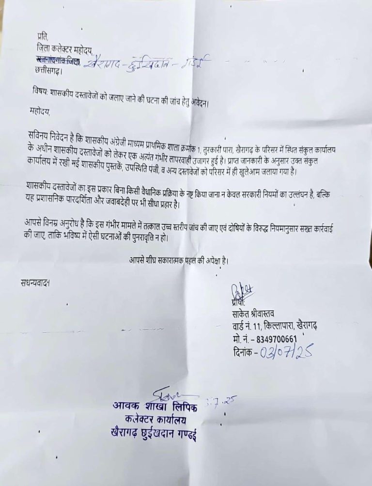 घटना की शिकायत मिलने पर नागरिकों ने जिला कलेक्टर सुमन राज के नाम ज्ञापन सौंपा, जिसे संयुक्त कलेक्टर सुमन राज ने प्राप्त किया. उन्होंने कहा कि “शासकीय दस्तावेजों को जलाने की शिकायत गंभीर है. जिला शिक्षा अधिकारी को जांच के निर्देश दिए गए हैं. दोषियों के खिलाफ नियमानुसार सख्त कार्रवाई होगी ताकि भविष्य में ऐसी लापरवाही न हो.”