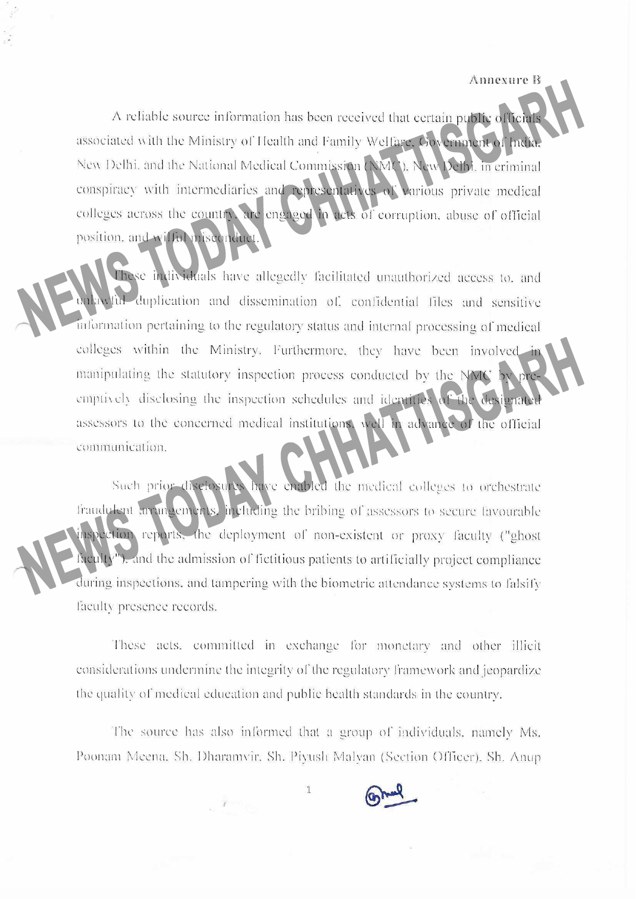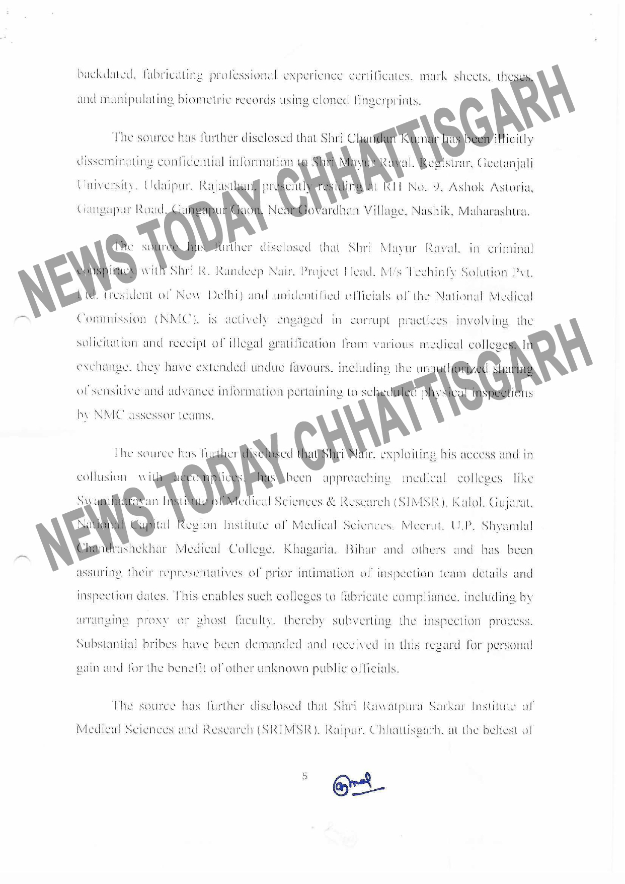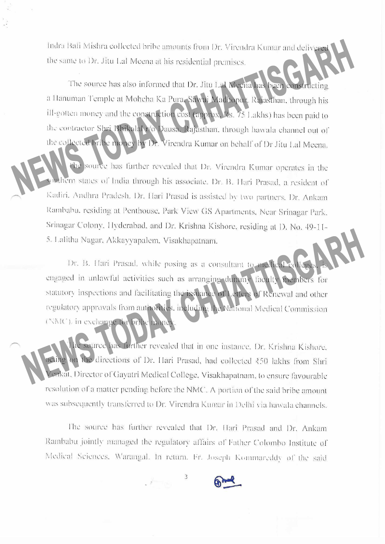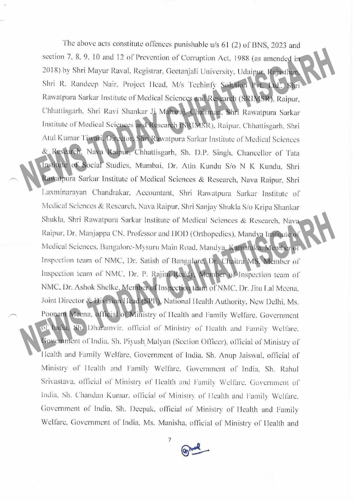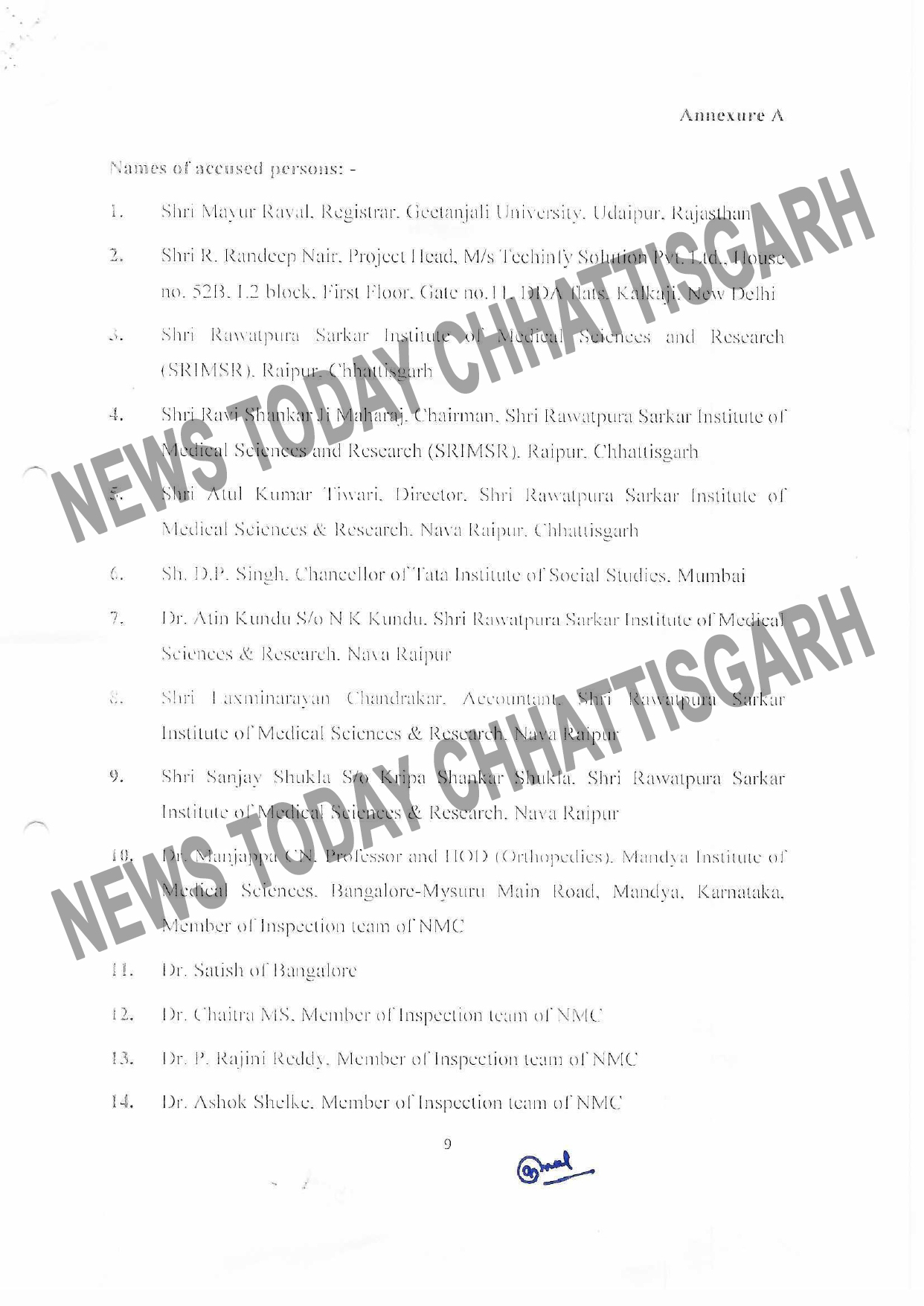 दिल्ली/रायपुर: CBI ने 40 से अधिक ठिकानों पर छापेमारी कर कई मेडिकल कॉलेजों में हड़कंप मचा दिया है। ऐसे कॉलेजों में रायपुर के रावतपुरा सरकार इंस्टिट्यूट का नाम भी सामने आया है। ताज्जुब करने वाली बात यह है कि CBI की FIR में तमाम आरोपियों के नाम न केवल मान-सम्मान के साथ दर्ज किए गए हैं बल्कि चौंकाने वाले भी हैं। इनमें प्रमुख नाम प्रसिद्ध संत श्री रविशंकर जी महाराज का है। FIR में क्रमांक (4) पर श्री रविशंकर जी को मेडिकल कॉलेज का चेयरमैन बताया गया है। जबकि CBI में दर्ज FIR में आरोपी क्रमांक (6) डी.पी. सिंह को बनाया गया है। वे टाटा इंस्टिट्यूट ऑफ सोशल स्टडीज, मुंबई के चेयरमैन बताए जाते हैं।