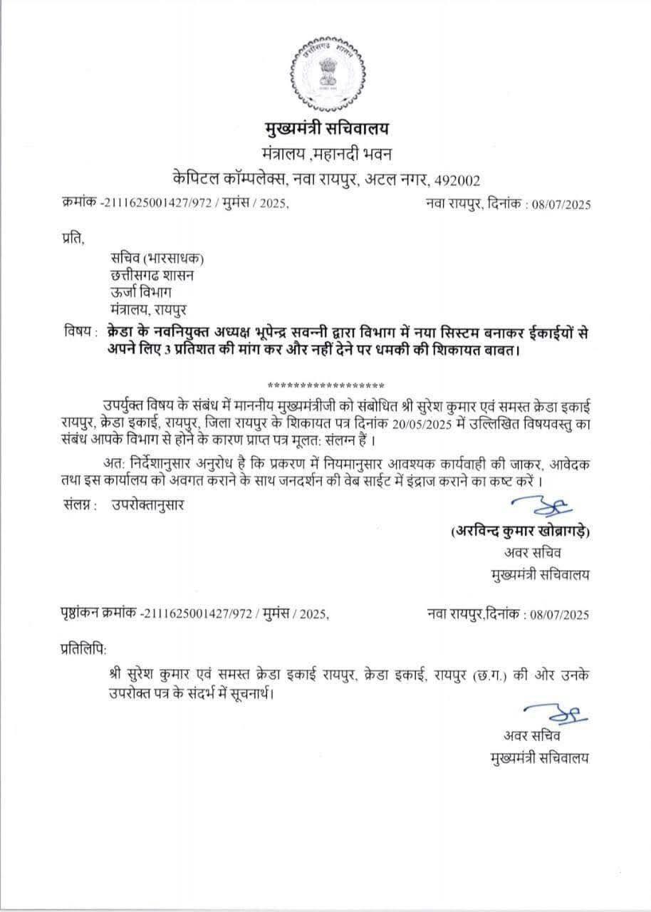 उधर, CM सचिवालय में की गई शिकायतों का पुलिंदा बाहर आने से बीजेपी के भीतर की राजनीति भी गरमाई हुई है। मुख्यमंत्री कार्यालय ने भ्रष्टाचार के खिलाफ जीरो टॉलरेंस नीति का पालन करते हुए इस शिकायत की जाँच शुरू कर दी है, ऊर्जा सचिव से इस बारे में रिपोर्ट मांगी गई है। जाँच कब परवान चढ़ेगी, इसे लेकर भी गहमा -गहमी देखी जा रही है।