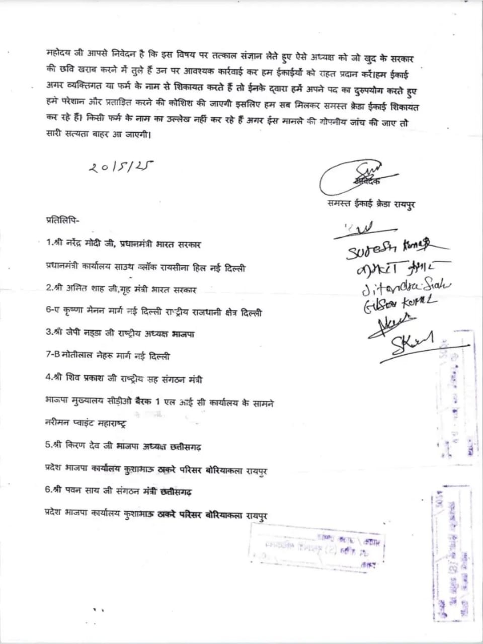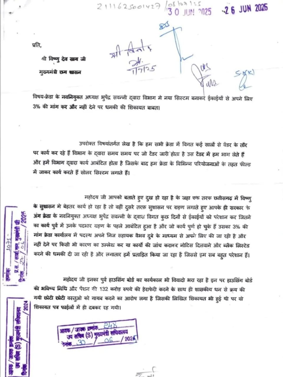 दरअसल, विभागीय कमीशन को लेकर तय पैमाना इन दिनों राजनैतिक गलियारों में चर्चा का विषय बना हुआ है। इस बीच बीजेपी नेता सवन्नी ने उन पर लगे आरोपों को लेकर सफाई दी है। उन्होंने आरोप लगाया कि किसी अज्ञात व्यक्ति की शिकायत को संज्ञान में लेकर उनके खिलाफ मुख्यमंत्री कार्यालय द्वारा जाँच के निर्देश दिए गए है। उन्होंने साफ़ किया कि शिकायत पत्र में शिकायतकर्ता के हस्ताक्षर तक नहीं है, यहाँ तक की शिकायतकर्ता का नाम और पहचान व पता ठिकाना भी दर्ज नहीं है ? इसके बावजूद भी उनके खिलाफ जाँच के निर्देशः दिए गए है। उधर, सवन्नी के समर्थन में छत्तीसगढ़ बिजनेस वेलफेयर एसोसिएशन भी मैदान में कूद गया है। बीजेपी नेता भूपेंद्र सवन्नी के समर्थन में उतरे व्यापारियों ने मुख्यमंत्री विष्णुदेव को पत्र लिख कर सवन्नी के खिलाफ शिकायत को फर्जी बताया है।