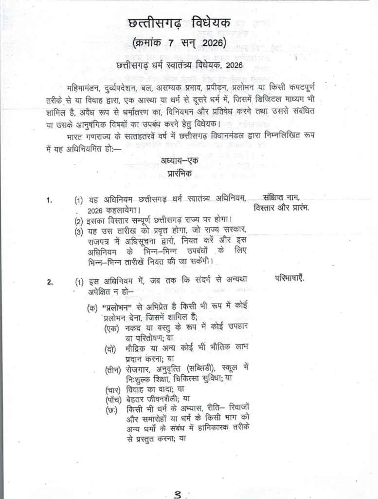 दरअसल,छत्तीसगढ़ धर्म स्वातंत्र्य विधेयक 2026 पर सदन में जोरदार बहस जारी है और इसके आज पारित होने की संभावना जताई जा रही है। सत्ता पक्ष इसे धर्मांतरण पर लगाम लगाने वाला मजबूत कानून बता रहा है, वहीं विपक्ष इसे लेकर सवाल खड़े कर रहा है। विधानसभा में दिनभर तीखी नोकझोंक और आरोप-प्रत्यारोप का दौर जारी है। सरकार का दावा है,कि यह कानून जबरन, प्रलोभन या दबाव के जरिए होने वाले धर्म परिवर्तन को रोकने के लिए लाया गया है। खास बात यह है कि आदिवासी इलाकों में इस विधेयक को लेकर समर्थन भी देखने को मिल रहा है और कई जगहों पर इसे लेकर सकारात्मक प्रतिक्रिया सामने आई है।
