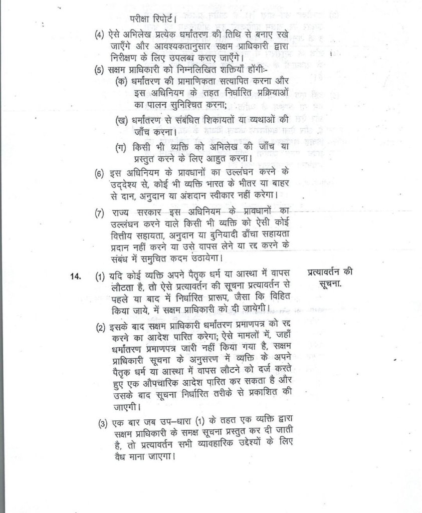 प्रस्तावित कानून के तहत बल, प्रलोभन, दबाव, मिथ्या जानकारी या कपटपूर्ण तरीके से धर्म परिवर्तन कराना प्रतिबंधित किया गया है। यदि कोई व्यक्ति स्वेच्छा से धर्म परिवर्तन करना चाहता है,तो उसे पहले जिला मजिस्ट्रेट या सक्षम प्राधिकारी को सूचना देनी होगी। इस प्रस्तावित धर्मांतरण की जानकारी सार्वजनिक रूप से प्रदर्शित की जाएगी और 30 दिनों के भीतर आपत्ति दर्ज कराने का प्रावधान रखा गया है। विधेयक में प्रलोभन, प्रपीड़न, दुर्व्यपदेशन, सामूहिक धर्मांतरण और डिजिटल माध्यम से धर्मांतरण जैसी परिभाषाओं को स्पष्ट किया गया है। साथ ही, पैतृक धर्म में वापसी को धर्मांतरण नहीं माना जाएगा।