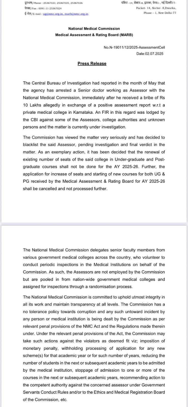 एजेंसियों की कार्रवाई के बाद राष्ट्रीय चिकित्सा आयोग की सफाई भी सामने आई है। उसने बयान जारी कर कहा है कि केंद्रीय जांच ब्यूरो ने मई महीने में एक रिपोर्ट में कहा था कि राष्ट्रीय चिकित्सा आयोग में मूल्यांकनकर्ता के रूप में काम कर रहे एक वरिष्ठ डॉक्टर को कर्नाटक के एक निजी मेडिकल कॉलेज के संबंध में सकारात्मक मूल्यांकन रिपोर्ट के बदले में कथित तौर पर 10 लाख रुपये की रिश्वत लेने के तुरंत बाद गिरफ्तार किया गया था।