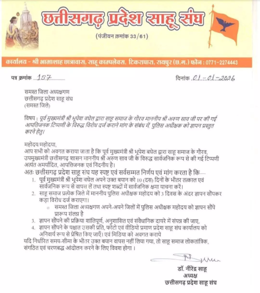 साहू समाज के अध्यक्ष नीरेन्द्र साहू ने बघेल से माफ़ी की मांग की है, साहू समाज ने पत्र जारी कर कहा है कि, भूपेश बघेल 10 दिनों के अंदर माफी मांगें। अन्यथा समाज उनके खिलाफ आंदोलन करने पर मजबूर होगा। साहू समाज ने कहा कि डिप्टी CM अरुण साव समाज के गौरव है, उनके खिलाफ अभद्र टिप्पणी बर्दाश्त नहीं की जाएगी। पूर्व मुख्यमंत्री के खिलाफ ज्ञापन सौंपने के लिए साहू समाज ने सभी जिलाध्यक्षों को पत्र जारी किया है। इस बारे में सामाजिक नेता 5 जनवरी को प्रेस कॉन्फ्रेंस करेंगे।