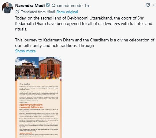 प्रधानमंत्री नरेंद्र मोदी ने भी केदारनाथ धाम के कपाट खुलने पर सोशल मीडिया के माध्यम से अपनी शुभकामनाएं दीं। उन्होंने कहा कि देवभूमि उत्तराखंड में स्थित श्री केदारनाथ धाम और चारधाम यात्रा भारतीय आस्था, एकता और सनातन परंपरा का दिव्य प्रतीक है। उन्होंने बाबा केदार से सभी श्रद्धालुओं की सुखद और मंगलमय यात्रा की कामना की।