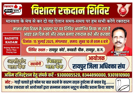 रायपुर जिला अधिवक्ता संघ के बैनर तले आयोजित इस शिविर में कई वकीलों ने शिरकत कर रक्तदान करने में देरी नहीं की | इसके साथ ही वकीलों के खून की चर्चाएं शुरू हो गई | कई वरिष्ठ वकीलों ने रक्तदान कर लोगों को इसका महत्त्व भी समझाया | कोर्ट परिसर में बिलासा ब्लड बैंक के दो लाल रंग के वाहन विशेष रूप से अपनी सेवाएं प्रदान कर रहे थे | इन वाहनों के भीतर लेबोरेटरी और पैरा मेडिकल फैसिलिटी उपलब्ध कराई गई है |