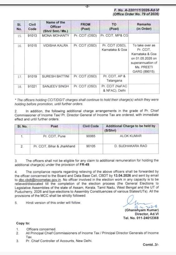 रायपुर : नए वित्तीय वर्ष की शुरुआत के साथ ही Central Board of Direct Taxes यानी CBDT ने बड़ा प्रशासनिक बदलाव किया है। देशभर में 18 नए Principal Chief Income Tax Commissioners की नियुक्ति की गई है।इसी क्रम में अब तक दोहरे प्रभार में चल रहे छत्तीसगढ़-मध्यप्रदेश सर्किल को अलग करते हुए नई नियुक्ति कर दी गई है। मोना मोहंती को इस अहम पद की जिम्मेदारी सौंपी गई है।बताया जा रहा है कि इससे पहले सुमित कुमार, जो राजस्थान में Principal Chief Income Tax Commissioner हैं, जनवरी से इस सर्किल का अतिरिक्त प्रभार संभाल रहे थे।अब मोना मोहंती की नियुक्ति के बाद दोनों राज्यों में आयकर विभाग के कामकाज को और मजबूती मिलने की उम्मीद है।
