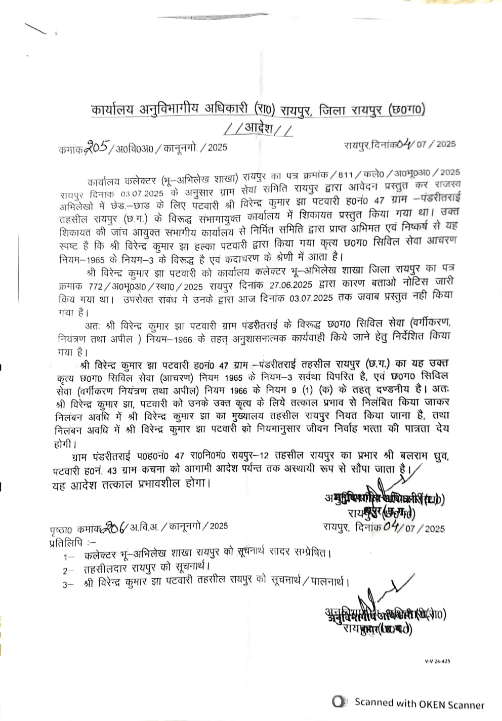 रायपुर: रायपुर में सरकारी और गैर-सरकारी जमीनों की अफरा-तफरी में शामिल एक पटवारी को कलेक्टर ने निलंबित कर दिया है। इस पटवारी ने चंद रुपयों के लालच में सरकारी रिकॉर्ड में न केवल हेरफेर किया था बल्कि नक्शा बिठाने,नापजोप और प्रमाणीकरण के मामले में भारी धांधली बरती थी। पीड़ितों ने मामले की शिकायत कलेक्टर से की थी। कलेक्टर रायपुर ने मामले की जांच के निर्देश दिए थे। पीड़ितों की शिकायत सही पाए जाने के उपरांत कलेक्टर ने पटवारी वीरेंद्र कुमार झा को फौरन निलंबित कर दिया है।