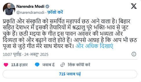 प्रधानमंत्री मोदी ने अपने एक्स अकाउंट पर लिखा, “प्रकृति और संस्कृति को समर्पित महापर्व छठ आने वाला है। बिहार सहित देशभर में इसकी तैयारियों में श्रद्धालु पूरे भक्ति-भाव से जुट चुके हैं। छठी मइया के गीत इस पावन अवसर की भव्यता और दिव्यता को और बढ़ाने वाले होते हैं। आपसे आग्रह है कि आप भी छठ पूजा से जुड़े गीत मेरे साथ शेयर करें। मैं अगले कुछ दिनों तक इन्हें सभी देशवासियों के साथ साझा करूंगा।”